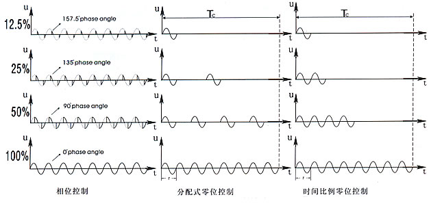 根據(jù)輸出電壓分布的不同,零位控制又分為分配式零位控制,既在Tc周期內(nèi)根據(jù)輸出百分比平均分布周波;時間比例零位控制則在Tc周期內(nèi)根據(jù)輸出百分比連續(xù)接通幾個周波,然后在Tc周期剩余的時間內(nèi)連續(xù)關掉幾個周波。